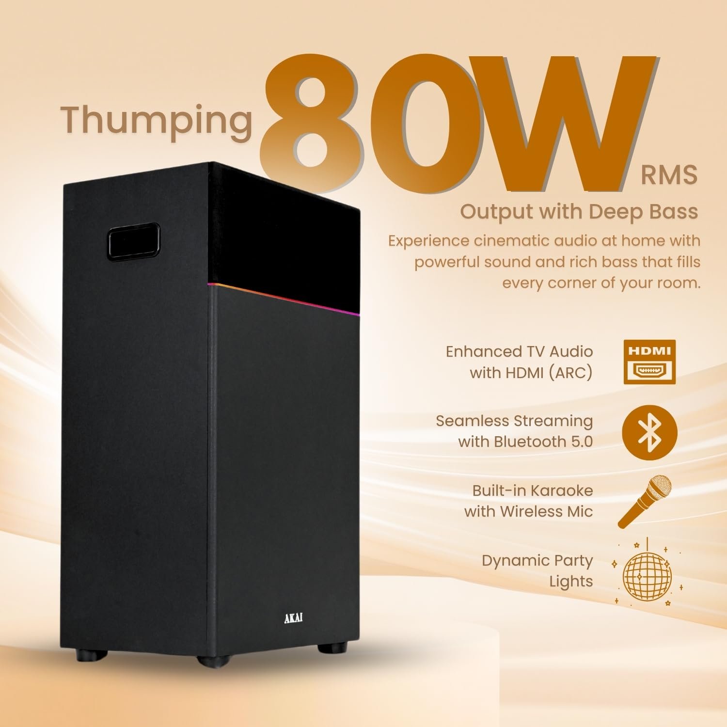 - 80W RMS OUTPUT WITH DEEP BASS – Experience room-filling audio with 80Watts RMS power, ideal for movies, parties, and home entertainment.