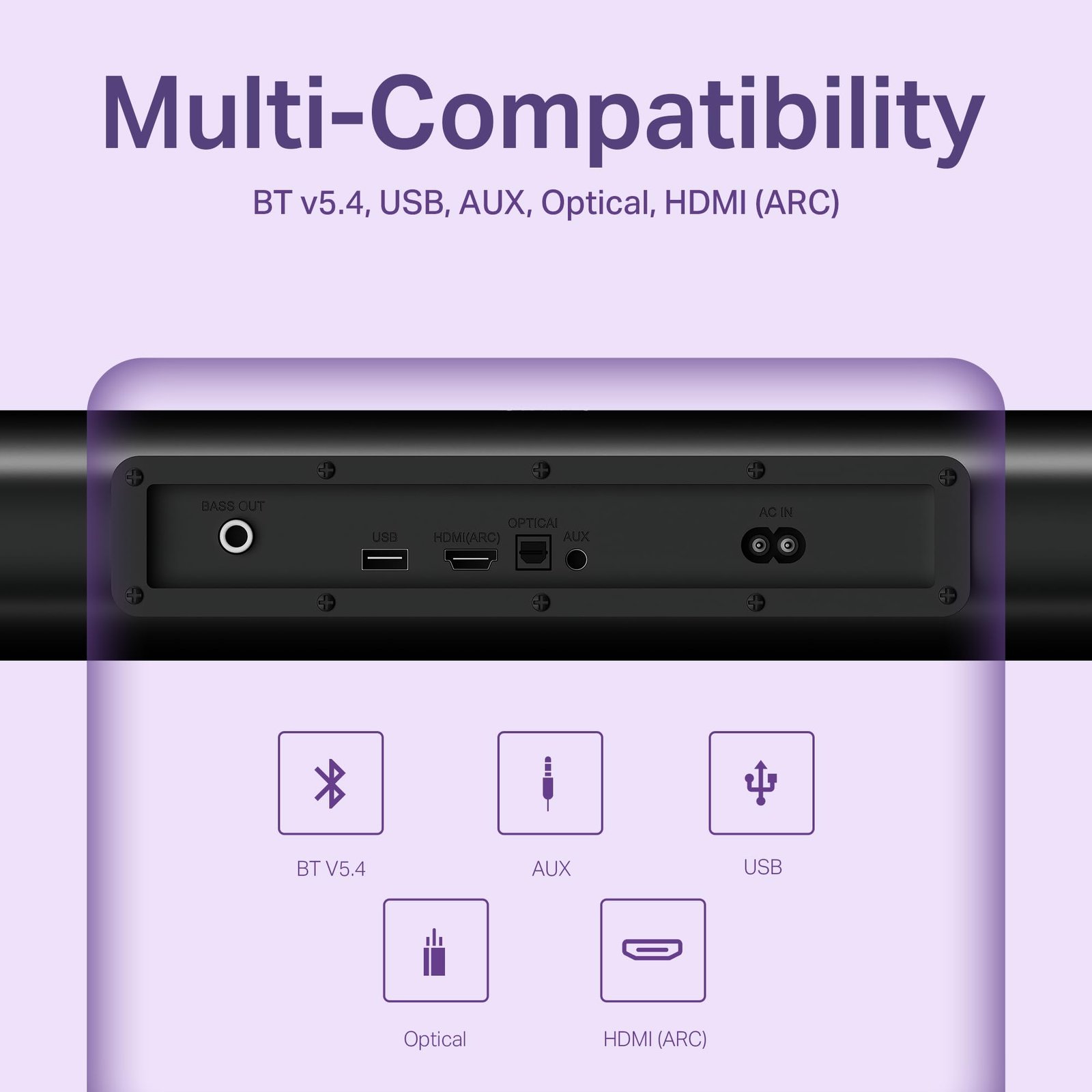 - Multiple Ports: Offering USB, aux, optical, Bluetooth v5.4, and HDMI (ARC) connectivity, you can stay plugged into the sound the way you prefer.