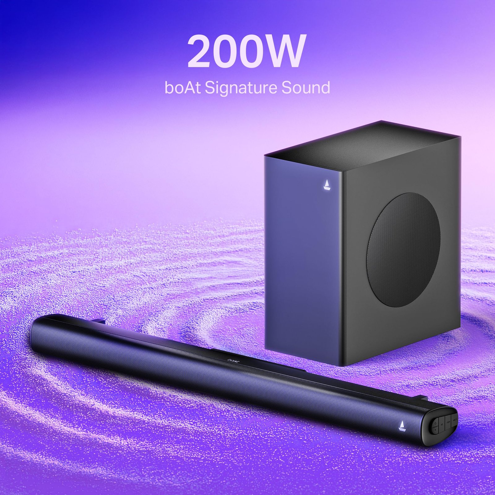 - Captivating Experience: Enjoy audio like never before with the boAt Aavante 2.1 2000 Bluetooth Soundbar. The integrated 200 W RMS boAt Signature Sound keeps you engrossed without interruptions.