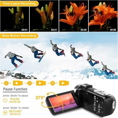- 🎥【Pause function and Recording While Charging】This vlogging camera supports the pause function, so you can pause the recording without starting on a new file. The vlogging camera is equipped with 2 batteries. A fully charged battery can last for around 90 minutes. This camcorder camera also supports recording while charging so no need to worry about missing any wonderful moments if your battery runs out during the shooting.