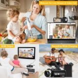 - 🎥【Webcam Function】This vlogging camera can be used as a webcam for YouTube /Skype /TikTok /Facebook live streaming or to make video calls with your family or friends. Moreover, You can also mount the HD camcorder on a standard tripod (Not included) and use the remote control to take pictures and videos. Additionally, it also supports up to 128GB SD card(Not included, above Class10, full size not micro card).