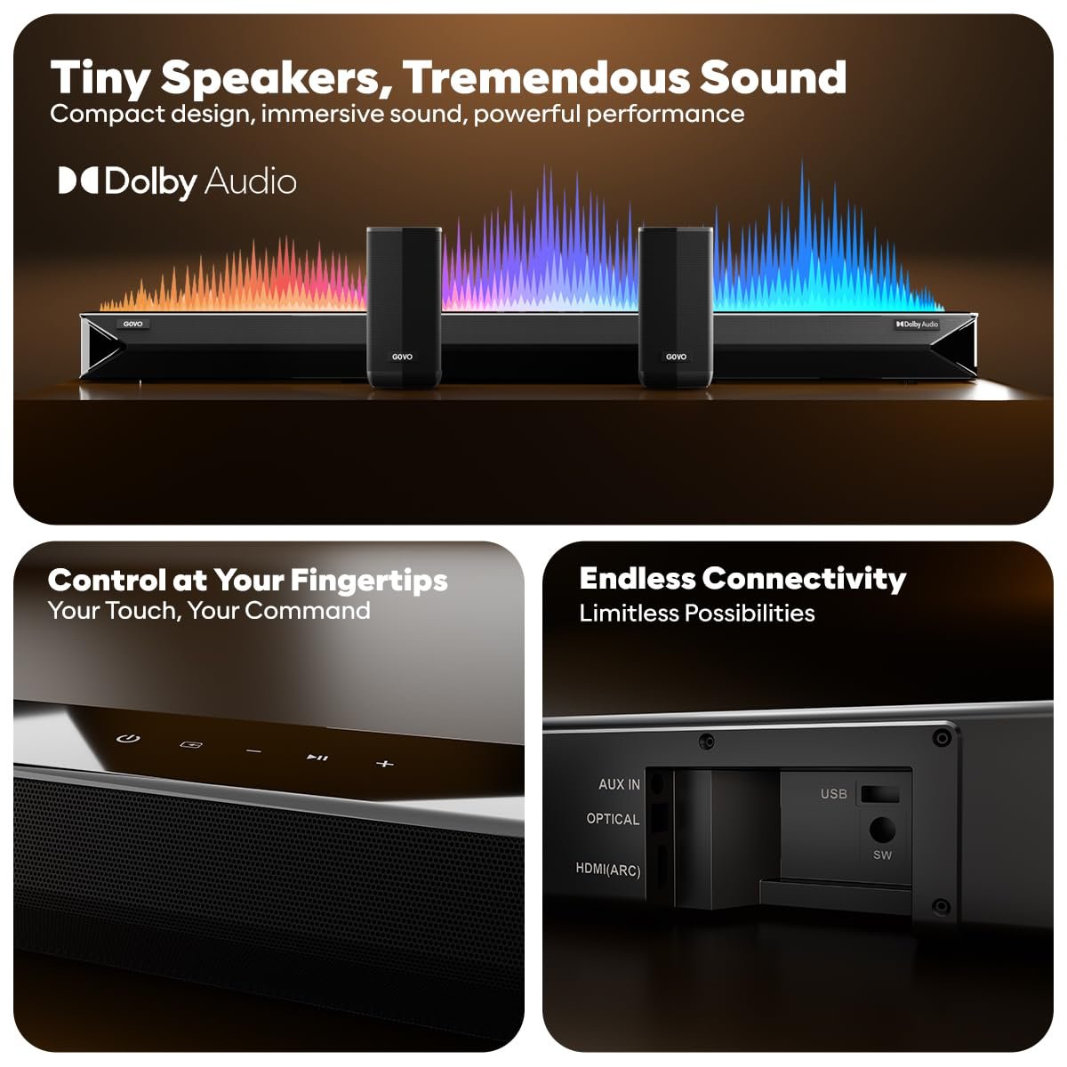 • Multiple Connectivity: Connect with HDMI (ARC), AUX, USB