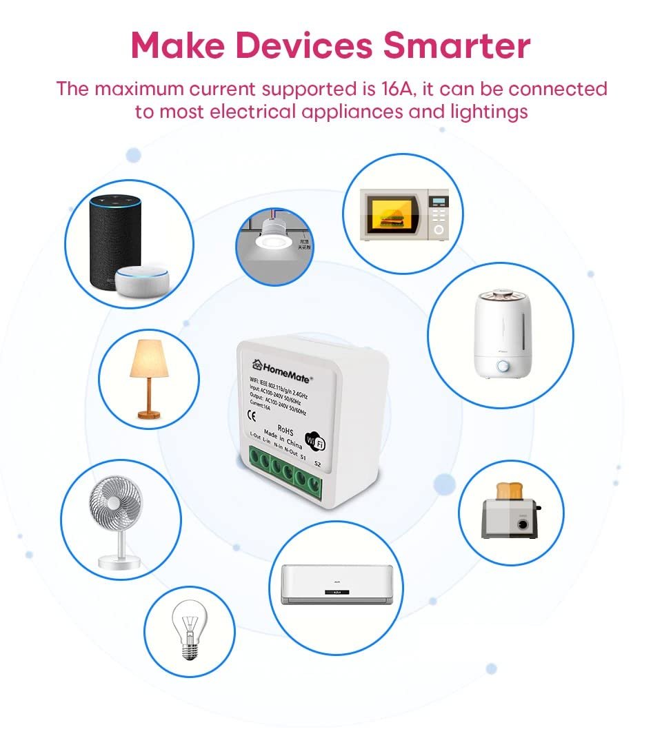 - Effortless WiFi Control – No Hub Needed : Connects directly to your home WiFi network without the need for an extra hub. This streamlined setup allows you to manage your switch through the HomeMate Smart app with ease.