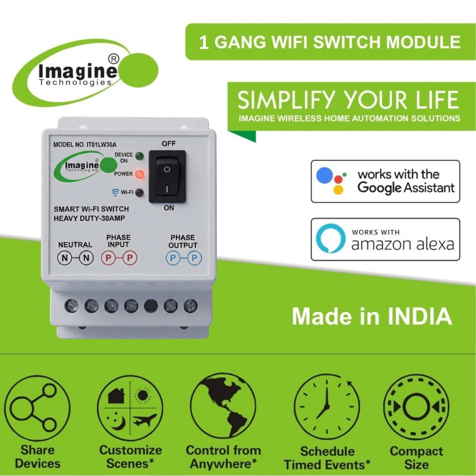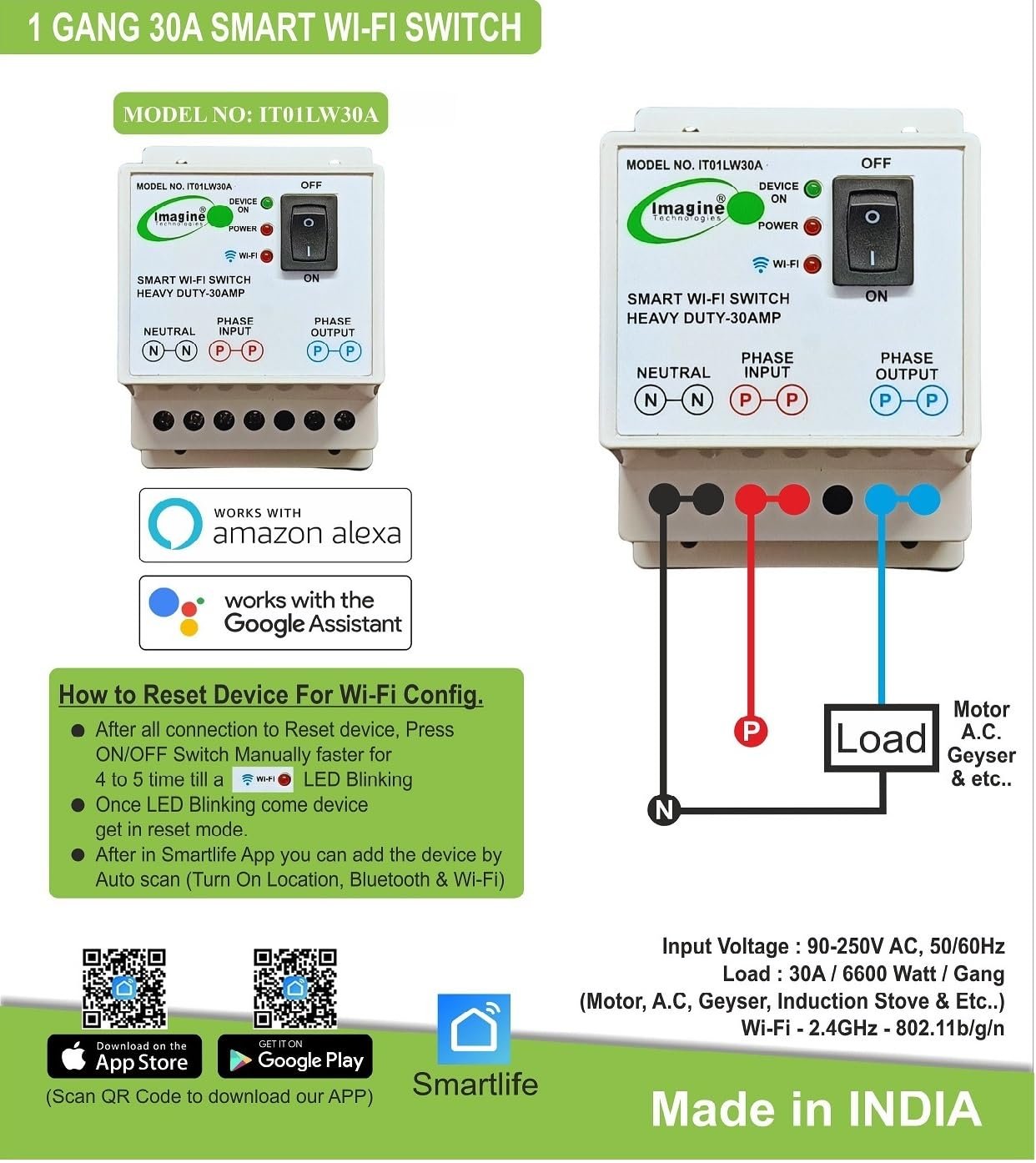 Details: Specifications: 1.Operating voltage 220-250 AC. 2. Frequency 50 /60 Hz. 3. Load capacity 30A (6600W) ,Can Control 1 Switch ON /OFF Separately .(Ac,Gyser,Motor) Product Dimensions : 7.2 x 10.3 x 4.8H CM. Working With 2.4Ghz, 802b/g/n. Product Description: IMAGINE SMART HOME 1 Gang Smart Retrofit Switch-The Smart is a Wi- Fi enabled smart device, which can easily be installed into your existing any module switchboard. Turn appliances and electronics on/off, and schedule the same from anywhere across the house, or from any part of the world, from the Smart Life app. Easy to Install and Easy to Use – Easy installation, easy handling and can be controlled remotely. Easy to remove as they are to install. 1 Gang Smart Switch can be taken out and reinstalled in any switchboard in house. Working Smoothly