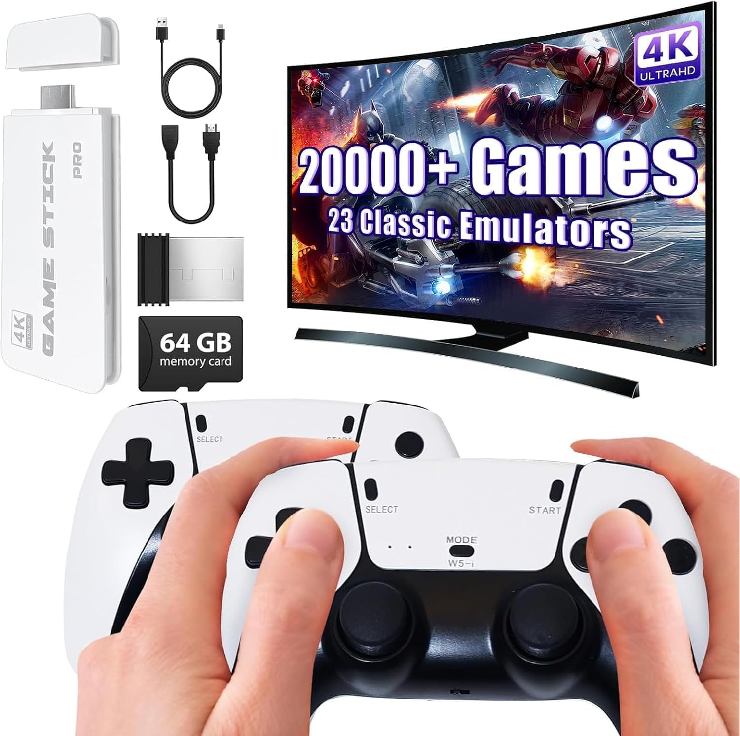 Details: PLUG & PLAY VIDEO TV GAME 4K ULTRA HD GAME STICK WITH 20000+ GAMES BUILT-IN, 10 EMULATORS TOY FOR KIDS, 64G, WIRELESS RETRO GAME CONSOLE, WHITE Equipped with an upgraded chip and pre-installed with 10 emulators, this console delivers smooth and stable performance. With a 64GB TF card included, you can play all your favorite classic games without the need to download or install anything. Perfect for excellent graphical quality and game fluency. Wireless game Console The console comes with 2 wireless controller adapters that offer stable connections with almost zero latency. The maximum connection distance is 32.8 ft,2.4GHz wireless game controller with stable connection, you can play it anywhere in your living room without worrying about being too close to your view. Wireless Retro Game Console Transform your TV into a gaming hub with our gaming consoles for TV, providing a wide range of entertainment options for the whole family. This portable mini game console has a lightweight and compact body, making it easy to carry without taking up much space. Game Console Educational Toy for Kids and Adults is Perfect Birthday Gift, Christmas, Diwali, Preschool Gift. It is also a great choice for parent-child interaction to enhance the parent-child relationship. It can also be a gift for yourself or a friend’s child to spend quality time with. birthday gift for kids In your spare time, it is a good choice to entertain with your friends and family, this game console allows you to share the fun of the game. The game is the perfect choice for everyone. It lets everyone enjoy the happy childhood of their parents. Gaming device Console It is fun to play popular games, explore new games is cool as well. Based on user safety, the device is made of ABS plastic, which is non-toxic and durable. Note :- Press SELECT and START simultaneously to return to the main menu. The Video Game Console supports 2 people to play games at the same time