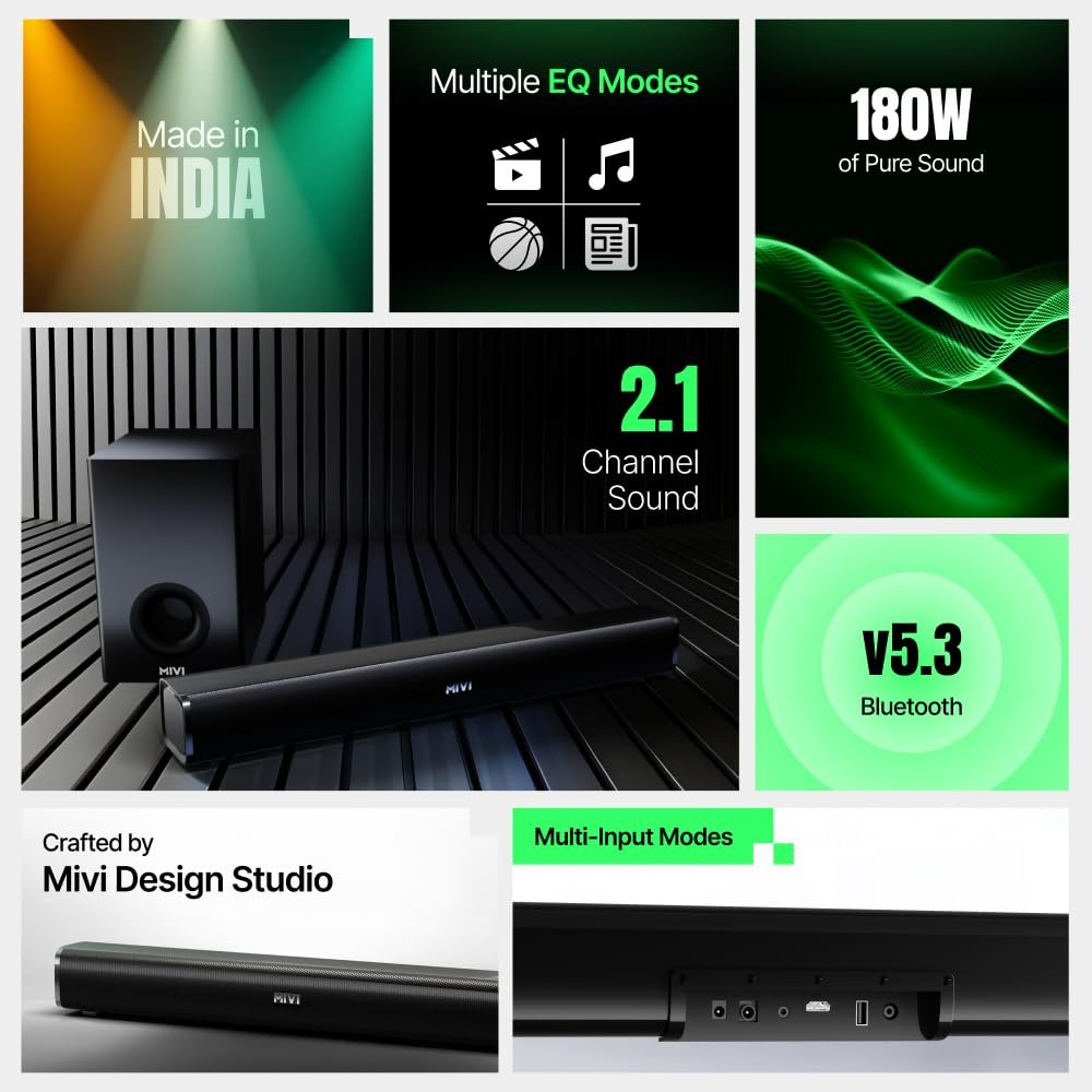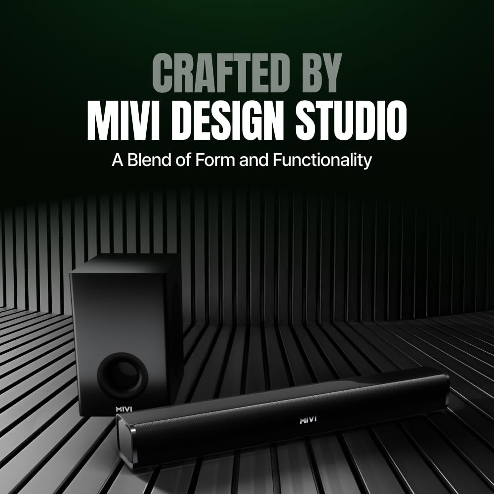 - ✅Crafted by Mivi Design Studio: A high-end metallic mesh grill on the soundbar and speakers with a high-end Matt finish on the cabinet blending seamlessly in a unique rounded cuboidal design makes for a chic ensemble. The overall look of the soundbar has been meticulously crafted to offer a minimalistic appeal.