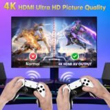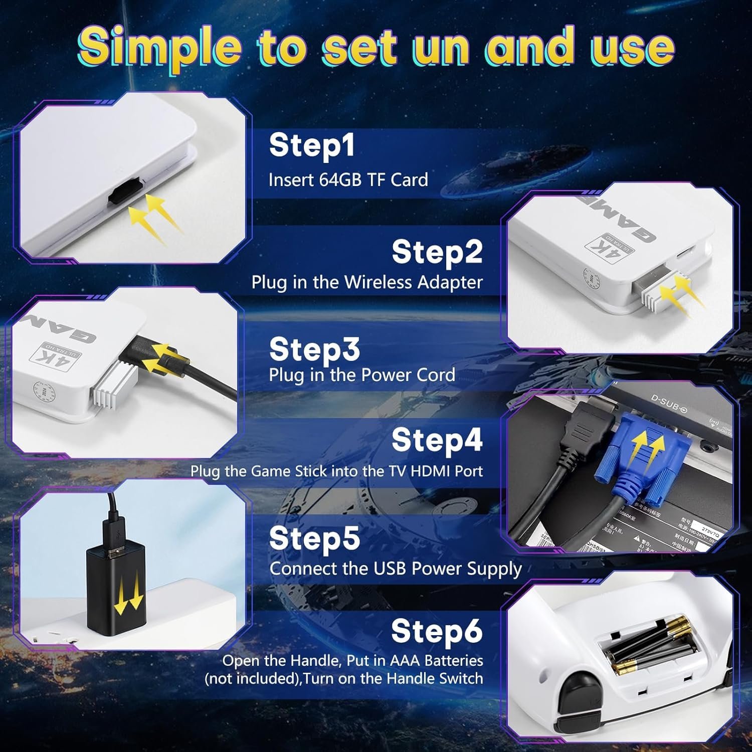 - 【2.4GHz Dual Wireless Controller】Dual 2.4G wireless controllers, high sensitivity, no complicated installation or setup required, perfect for video gamers of all ages. This game stick lengthens the handle, which feels better and is more convenient to operate; In addition, we have a search function – you can add a space to search for games; What’s more, it supports wireless two-player games, and after adding a hub, it can support up to four people playing games together.