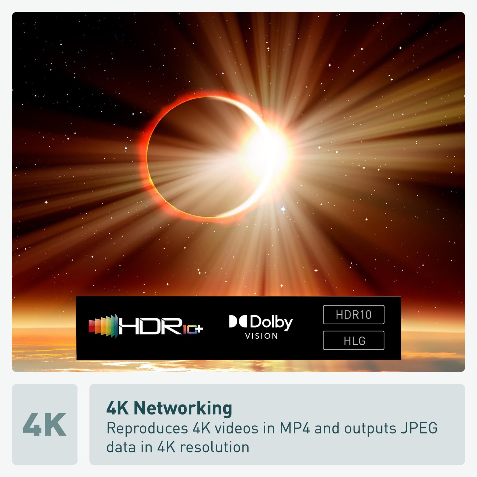 • 4K Networking: reproduce 4K videos in MP4 and you can output JPEG data in 4K resolution, to share photos from a camnera or camcorder
