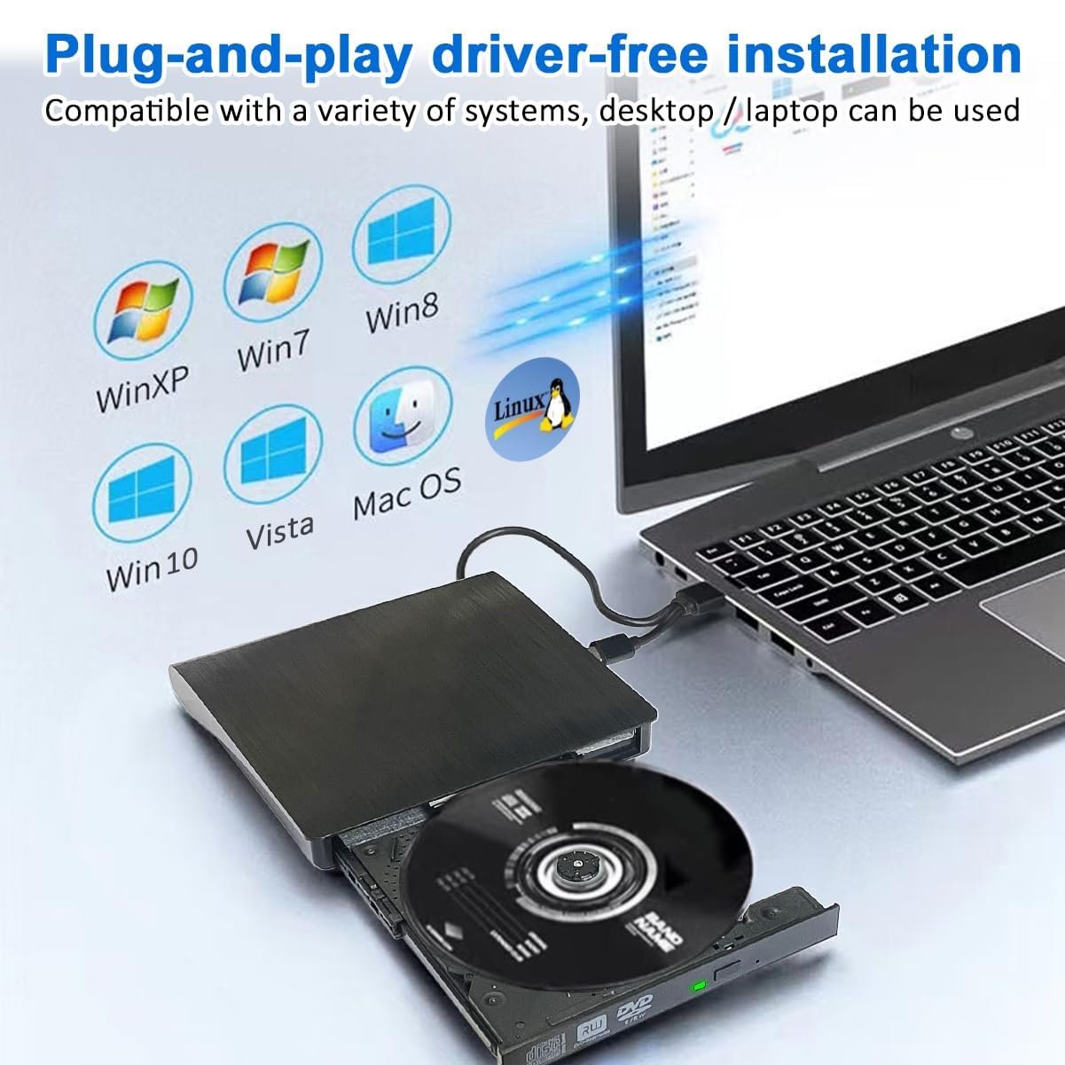 • 𝗛𝗶𝗴𝗵 𝗤𝘂𝗮𝗹𝗶𝘁𝘆 𝗖𝗵𝗶𝗽 & 𝗙𝗮𝘀𝘁 𝗣𝗿𝗼𝗰𝗲𝘀𝘀𝗶𝗻𝗴 𝘄𝗶𝘁𝗵 𝗟𝗮𝘁𝗲𝘀𝘁 𝗧𝗲𝗰𝗵𝗻𝗼𝗹𝗼𝗴𝘆: This RuhZa external CD/DVD drive uses the latest high-quality chip, which ensures faster data processing and improved accuracy. The advanced chipset allows for an incredibly smooth read for not only efficient business tasks but also for entertainment applications. Just plug into your computer with a USB 2.0/3.0 port or Type-C port and you can use this external drive immediately. No extern
