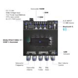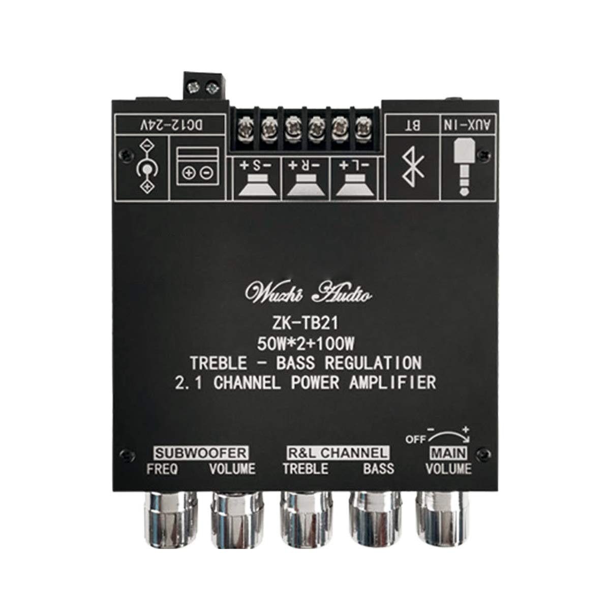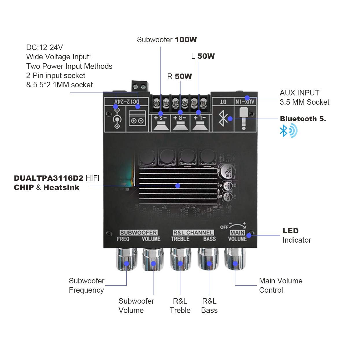 • 【Parameters】 Input voltage: DC 12V-24V; Maximum output power: 50W x 2 (R&L) + 100W (subwoofer); Input method: Bluetooth and AUX; Channel: Stereo output 2.1 CH; Output impedance: 4-8Ω; Bluetooth version: BT 5.0