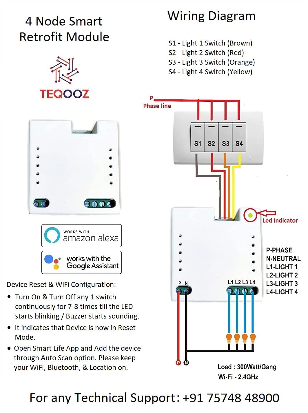 Details: TEQOOZ 4-Node Smart Wi-Fi Retrofit (In-Wall) Switch is a Wi-Fi enabled smart device, which can easily be installed behind any existing switchboard. This device has 4 Independent Switch Connections. 3 Connections are regular 6 Amp loads and 1 connection can take heavy load upto 16 Amp.