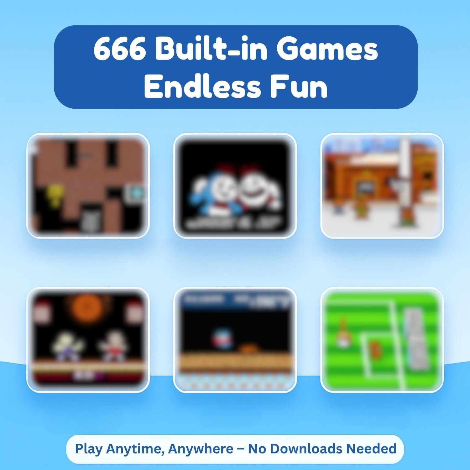 - đŽ 666 Classic Built-in Games â Fun for All Ages: Enjoy a huge collection of nostalgic retro games in one handheld gaming console. Ideal for kids, teens, and adults who love classic arcade-style gameplay. No Wi-Fi or internet needed!
