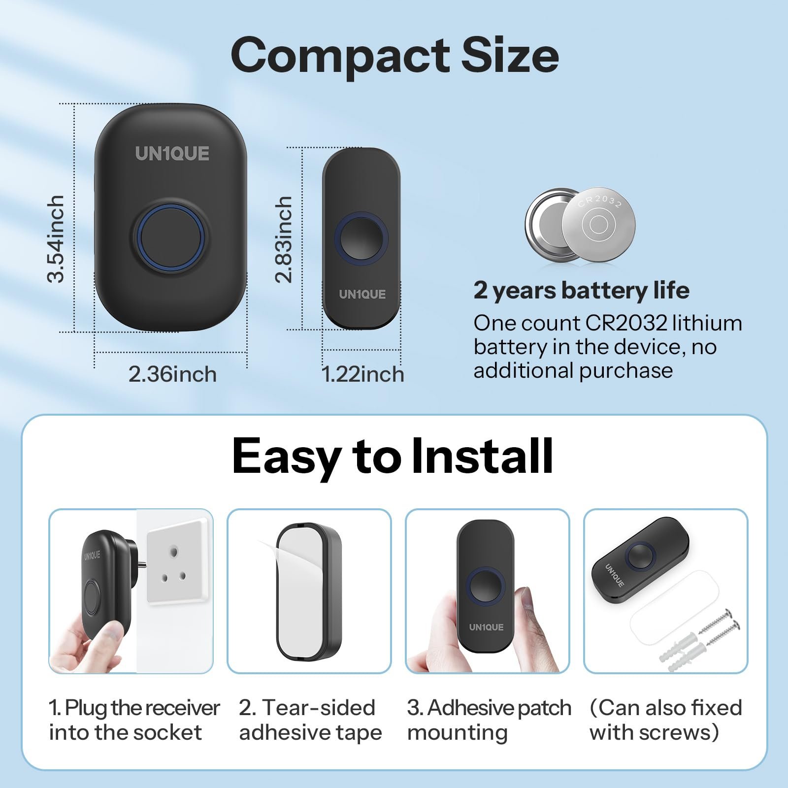 • [ Easy to install ] The doorbell is easy to install, and you can do it within a minute using all the tools you need. The doorbell and receiver have been paired before they were sold, so all you have to do is install and use them easily