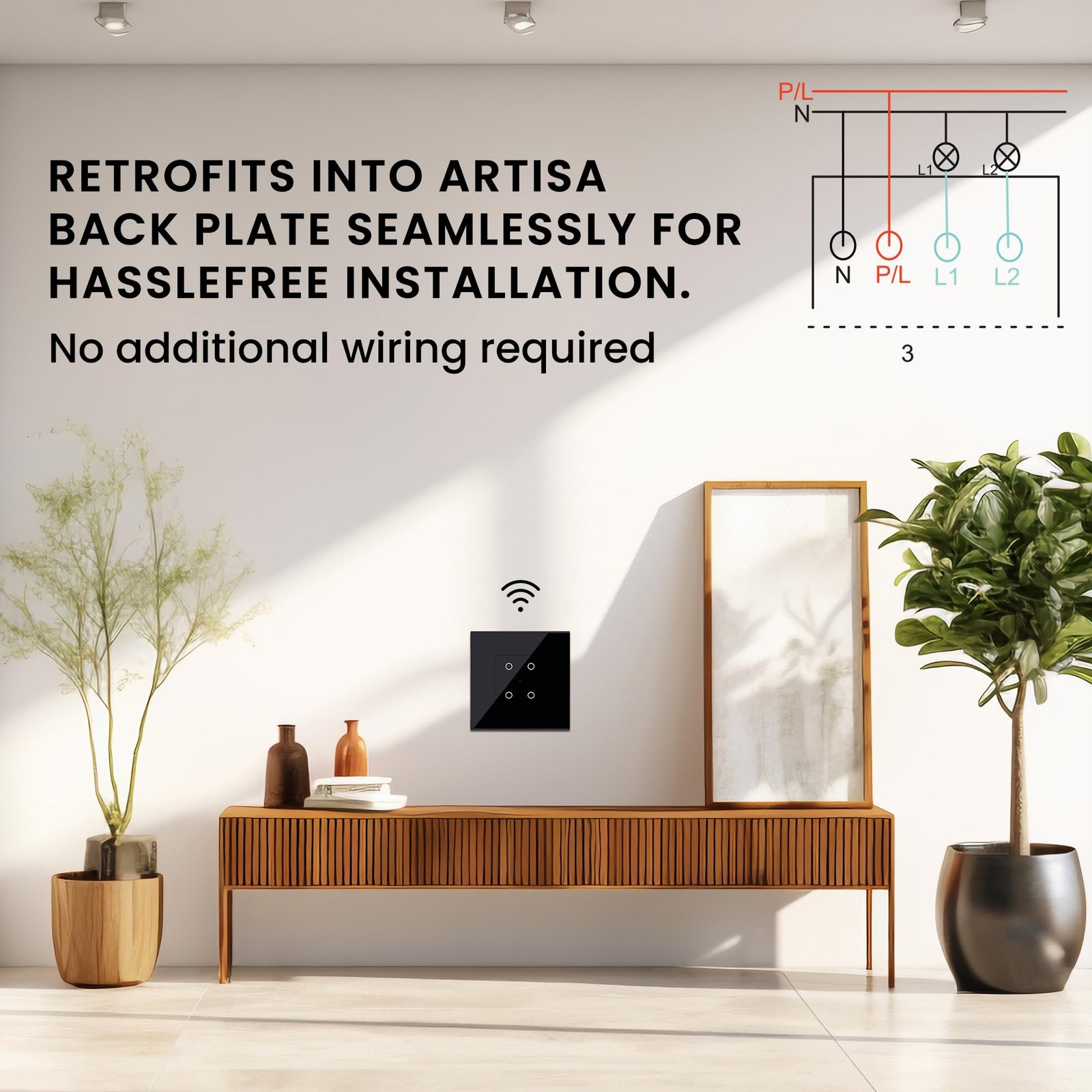 - Easy Retrofit Installation: Artisa Neo fits and installs in the Artisa back plates just like a normal switch, and doesn’t even need any additional wiring. It is simple, hasslefree, smart and intuitive.