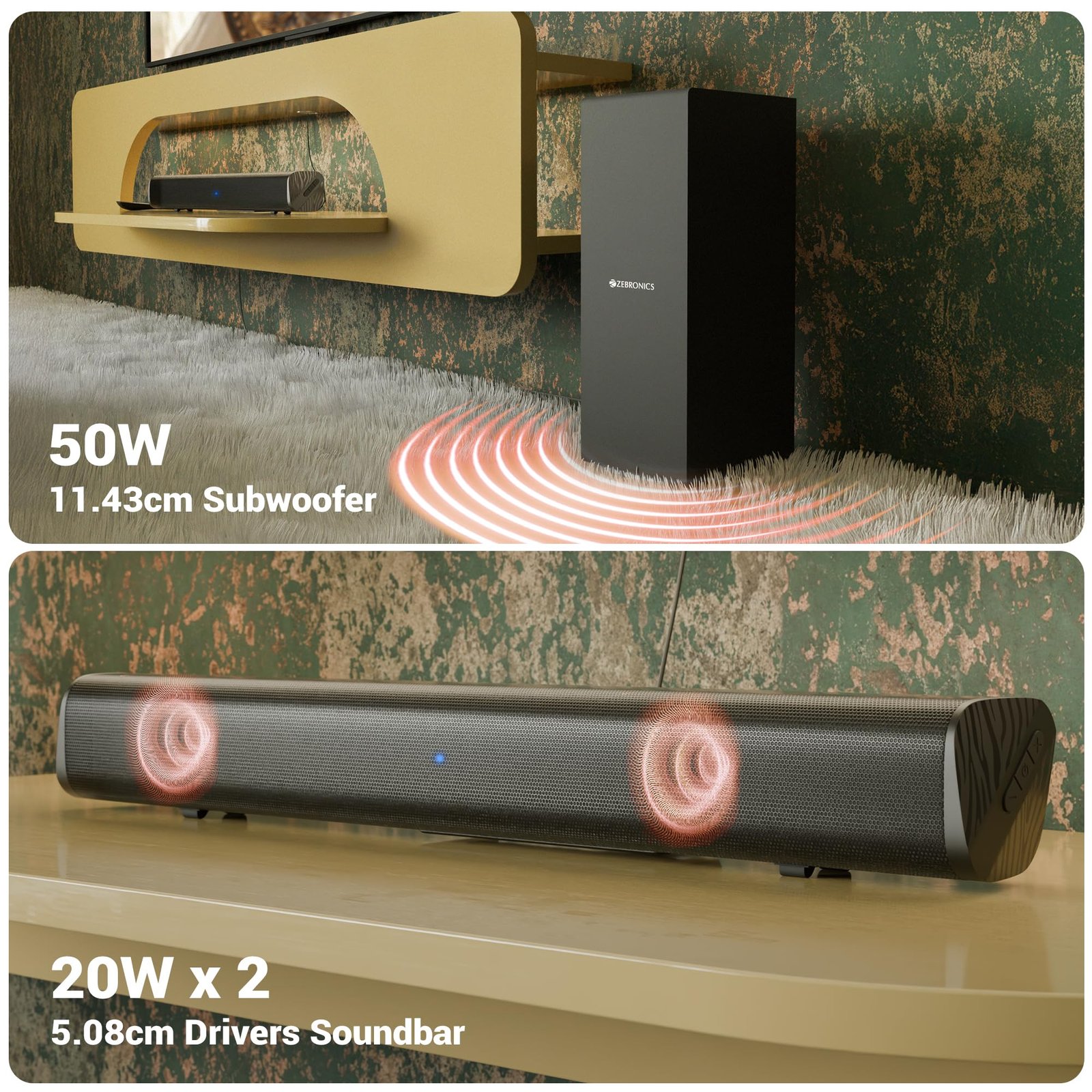 - Dynamic Output: The ZEB-Jukebar 200A delivers an impressive total output power of 90W RMS, with 50W from the subwoofer, and 20W x 2(40W) from the soundbar.
