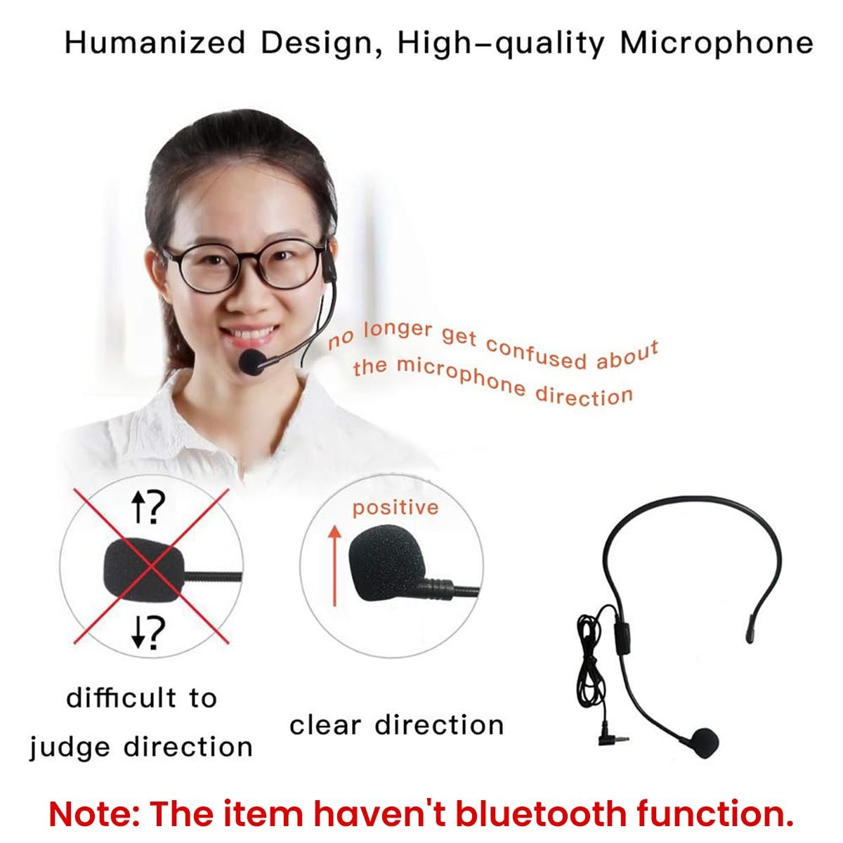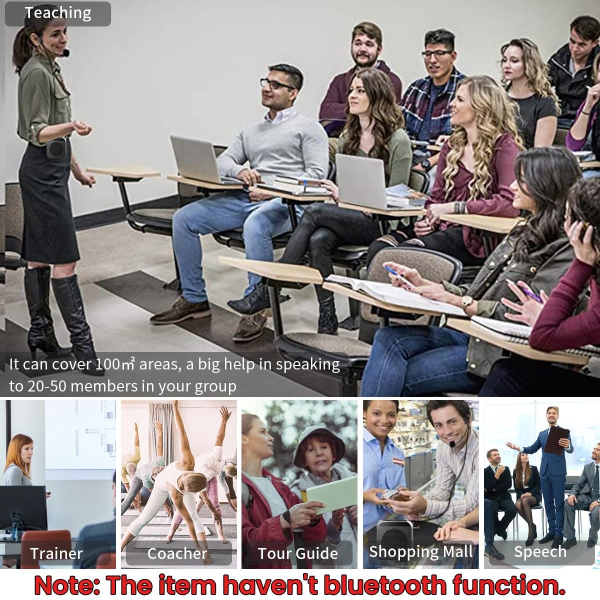 • POWERFUL SOUND: Compact size voice amplifier with 8W output is clear and noiseless, enough to cover a large room of 20-50 people. The microphone headset is lightweight and adjustable. You can adjust the distance between the microphone and mouth with its flexible gooseneck. Comfortable design for long sessions. Please keep the speaker and microphone at a distance to avoid facing each other so the signal won’t get affected. Note: The voice amplifier haven’t bluetooth function.